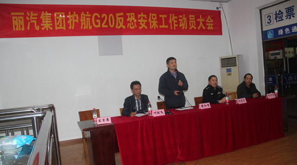為切實(shí)加強(qiáng)集團(tuán)公司反恐安保防范的各項(xiàng)工作,4月14日晚,麗汽集團(tuán)護(hù)航G20反恐安保工作動(dòng)員會(huì)在客運(yùn)東站候車室召開。集團(tuán)公司總經(jīng)理薛和有、反恐支隊(duì)長(zhǎng)葉亞平、集團(tuán)公司安全保衛(wèi)稽查部經(jīng)理葉少華出席會(huì)議,東站全體人員、各運(yùn)輸單位領(lǐng)導(dǎo)班子及安全人員共200余人參加大會(huì)。會(huì)議由集團(tuán)公司總經(jīng)理助理葉劍飛主持。
