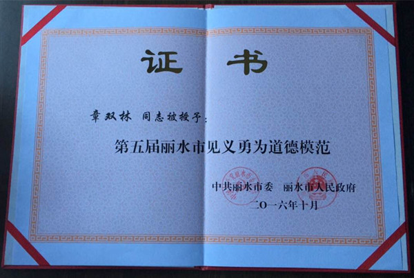 12月9日,蓮都區(qū)委區(qū)政府在蓮都劇場召開表彰會,表彰蓮都區(qū)第五屆道德模范獲獎?wù)?。麗汽集團長運公司駕駛員章雙林同志獲見義勇為道德模范受到表彰。 在10月31日,章雙林還獲得麗水市第五屆見義勇為道德模范,受到市委市政府表彰。