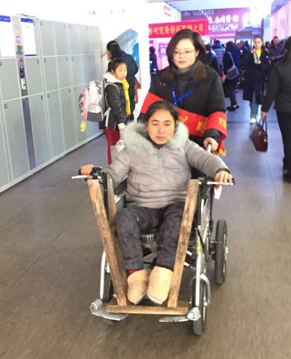3月1日12點(diǎn)左右,正值出行高峰,售票廳里人頭攢動,買票的長隊緩緩挪動著。一位中年女性乘客,身穿灰色棉衣,頭頂?shù)念^發(fā)有些斑白,被人群擠到了一旁。她雙手搭在輪椅的扶手上,費(fèi)力地往售票窗口前行。