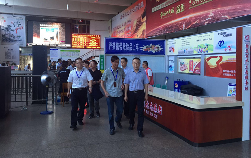 8月16日下午, 浙江省交通廳副廳長趙雁、市交通局副局長葉利東、市運管局副局長金昌平等領(lǐng)導(dǎo)到客運東站檢查安全生產(chǎn)工作。集團(tuán)公司董事長葉茂、副總經(jīng)理何赤詮、客運東站負(fù)責(zé)人江小華陪同檢查。