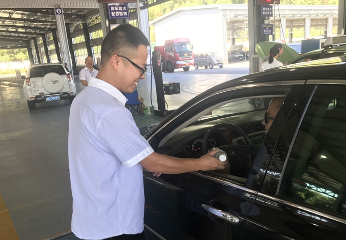8月29日上午10點,在安檢站的外檢車間,每條檢測線上整齊擺放著兩箱礦泉水,線上的檢測員微笑著向來參檢的車主發(fā)放礦泉水。