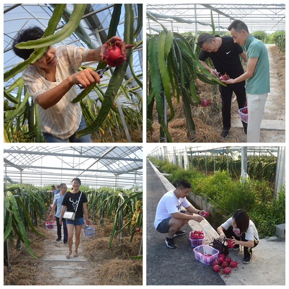 在缸窯村火龍果采摘基地,工作人員向大家介紹了基地火龍果的無公害種植模式和火龍果果肉、果皮以及花朵的食用價(jià)值。工會(huì)主席(組長)們也親自體驗(yàn)了一把火龍果的采摘??粗︻^紅艷誘人的果實(shí),大家臉上掛滿了的豐收喜悅。