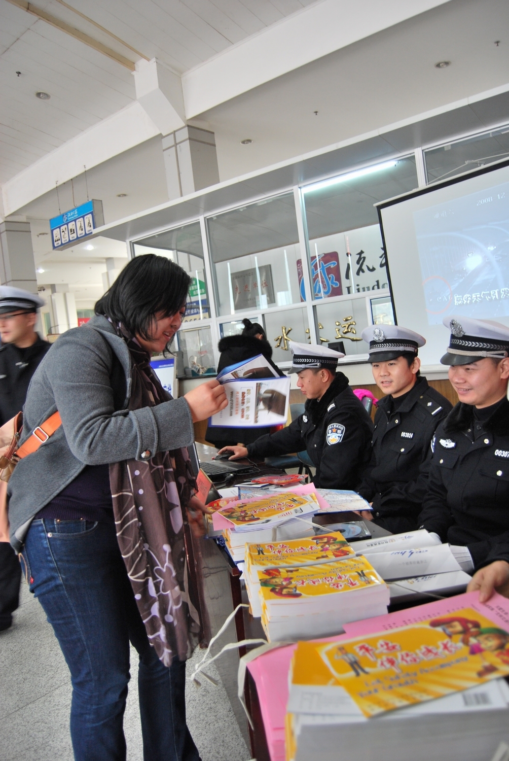 此次活動(dòng)以“關(guān)愛生命、文明出行”為主題,交警部門準(zhǔn)備了《平安伴你成長》、《道路交通事故警示錄》、《浙江省高速公路指南》等圖冊進(jìn)行發(fā)放,市交警隊(duì)的同志特意將《關(guān)愛生命、文明出行--全國實(shí)施“文明交通行動(dòng)計(jì)劃”倡議書》送到候車旅客手中,市運(yùn)管處、交通音樂頻道、高速交警支隊(duì)還進(jìn)行了春聯(lián)、“福”字和平安符現(xiàn)場贈(zèng)送,向過往旅客送出新年祝福。