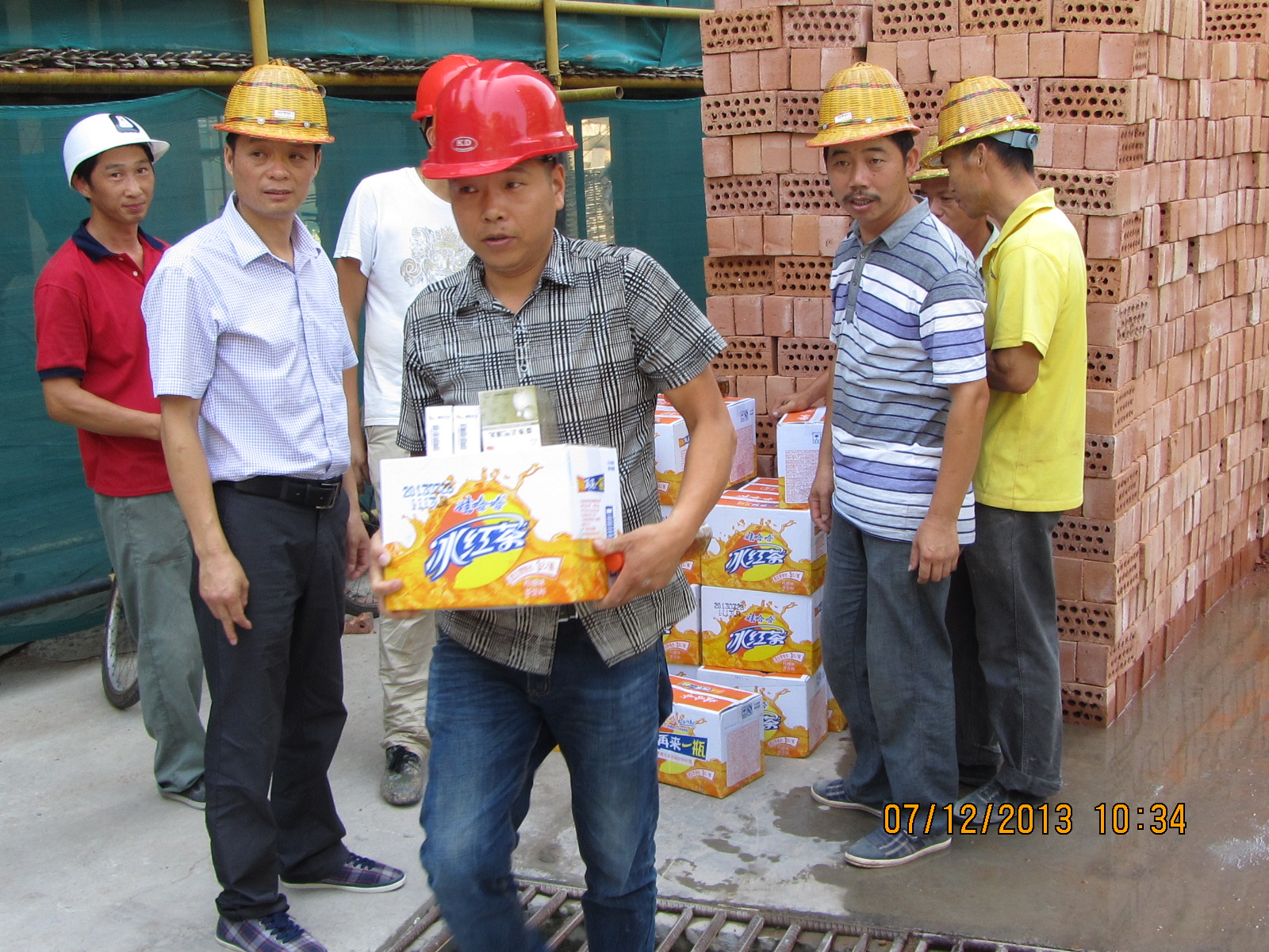 當前,夏日炎炎,驕陽似火,正值建筑施工生產(chǎn)旺季,金龍.長運花苑工地的工人師傅們頂著高溫酷暑辛勤地工作。2013年7月12日,南明房地產(chǎn)公司工程部在公司副總經(jīng)理的帶領下,帶著清涼食品和防暑保健藥品到施工現(xiàn)場積極開展“夏日送清涼”活動,給奮戰(zhàn)在一線的建筑工人送去項目部的關懷和慰問。并叮囑大家在高溫作業(yè)時,要合理安排作息時間,做好防暑降溫工作,并要求項目部做好食堂的飲食和疾病防疫等工作,在施工現(xiàn)場按照公司規(guī)定配備安全生產(chǎn)和職業(yè)防護設施,加大對工人的防暑降溫和中暑急救知識的宣傳教育,確保工人的身體健康和安全施工。