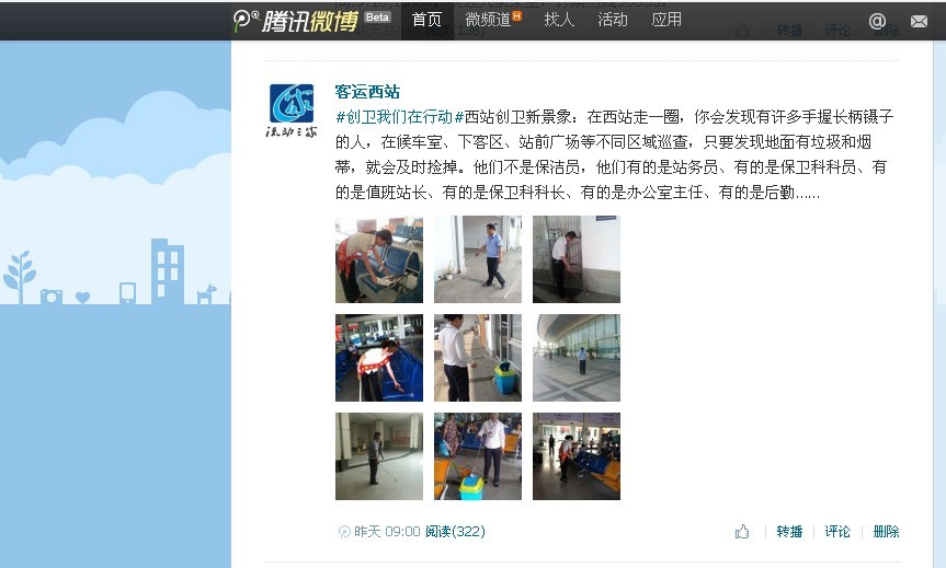 根據(jù)麗水市創(chuàng)建國(guó)家衛(wèi)生城市工作領(lǐng)導(dǎo)小組辦公室《關(guān)于利用微博做好創(chuàng)衛(wèi)宣傳工作的通知》,麗水客運(yùn)西站積極響應(yīng),并與8月21日在客運(yùn)西站騰訊微博賬戶(hù)開(kāi)通“創(chuàng)衛(wèi)我們?cè)谛袆?dòng)”專(zhuān)欄和“健康知識(shí)”專(zhuān)欄。