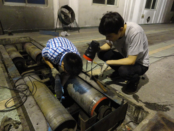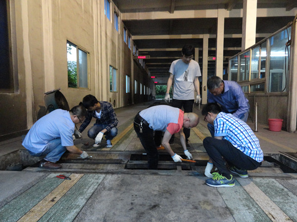 7月7日下午臨下班前,綜檢站1號(hào)檢測(cè)線的車速臺(tái)突然發(fā)生故障,舉升器無(wú)法正常升降。故障就是命令,為確保綜檢站高峰期檢測(cè)不受影響,檢測(cè)車間立即組織骨干人員對(duì)車速臺(tái)進(jìn)行檢查,就連正在年休的車間主任金軍輝也聞?dòng)嵹s回與部門員工一同作戰(zhàn)。經(jīng)過(guò)一番拆卸檢查,故障點(diǎn)基本確定是油缸漏油和舉升橫梁斷裂。可是,要維修這兩個(gè)大部件,就需要拆掉整個(gè)工位機(jī)的核心部分,其工作量和工作難度之大,讓在場(chǎng)的搶修人員都不由的皺緊了眉頭。面對(duì)艱巨任務(wù),車間副主任、高級(jí)技師金曉東發(fā)揮了黨員先鋒模范帶頭作用,迅速帶領(lǐng)青年員工對(duì)舉升橫梁進(jìn)行焊接技術(shù)改造。車間員工們也齊心協(xié)力開(kāi)始拆卸工位機(jī),更換油缸油封、密封圈等。白天已超負(fù)荷工作的檢測(cè)車間員工,不知不覺(jué)又堅(jiān)持了9個(gè)多小時(shí),直至7月8日凌晨01點(diǎn),最終圓滿完成了車速臺(tái)搶修任務(wù),確保了綜檢站高峰期檢測(cè)不受影響。